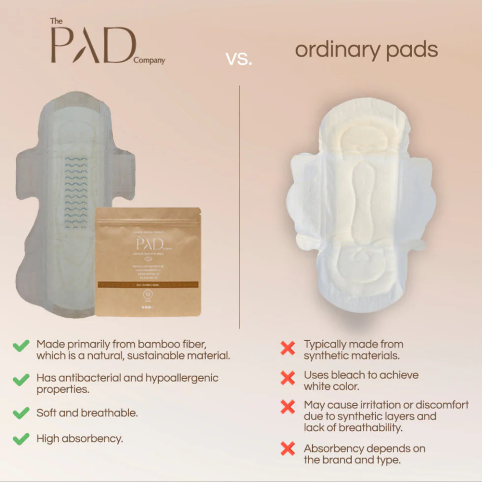 Bamboo pads are sanitary pads made from natural bamboo fibres, offering superior comfort and protection compared to traditional plastic-based pads. The top layer of our pads is crafted with 100% organic bamboo, while the silk-finished design works effectively to combat inflammation, banish unwanted odours, and provide natural antibacterial properties to protect and care for your skin.