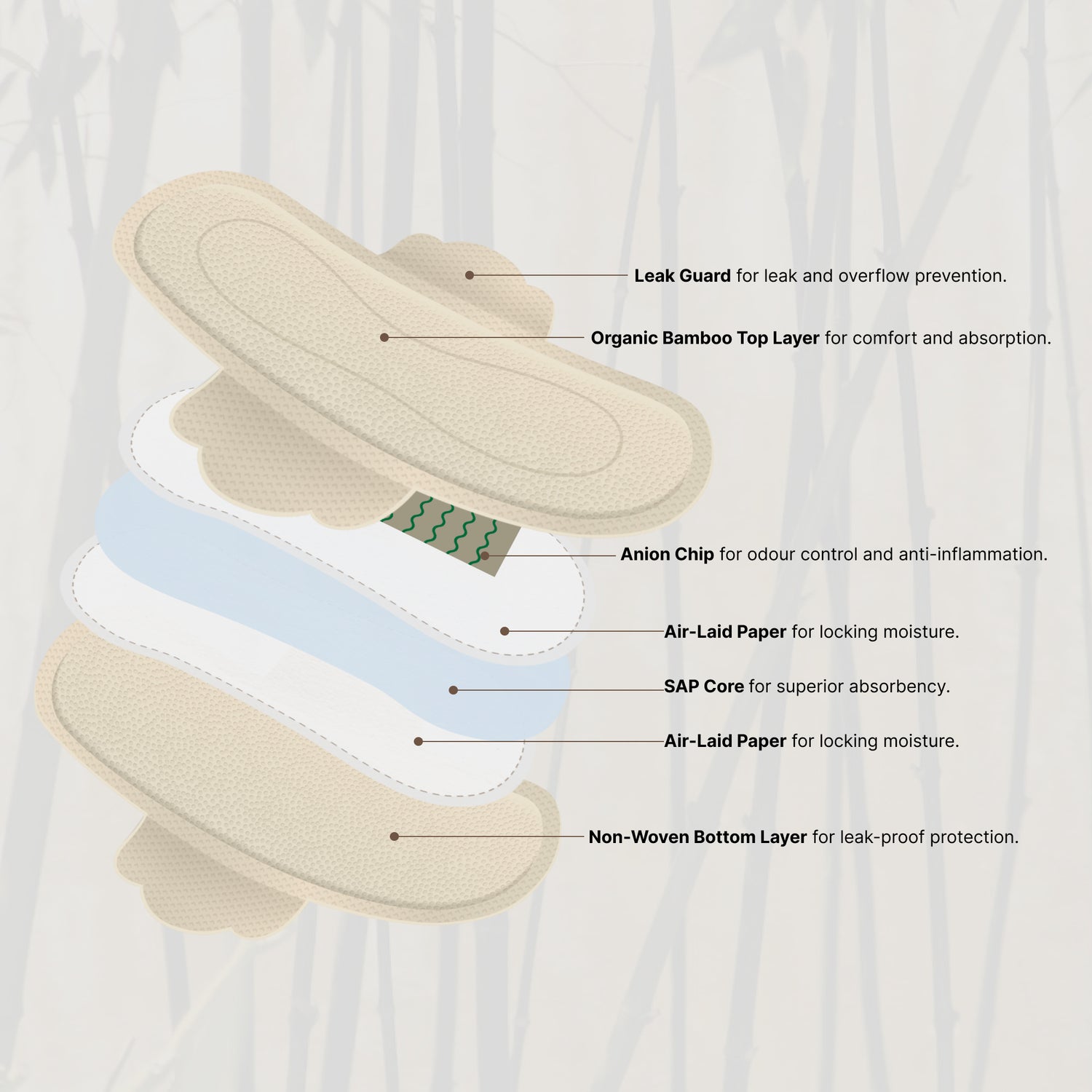 Our top-sheet is made with 100% organic bamboo, silk-finished pads combat inflammation and banish unwanted odours, along with natural antibacterial properties that protect and care for your skin.